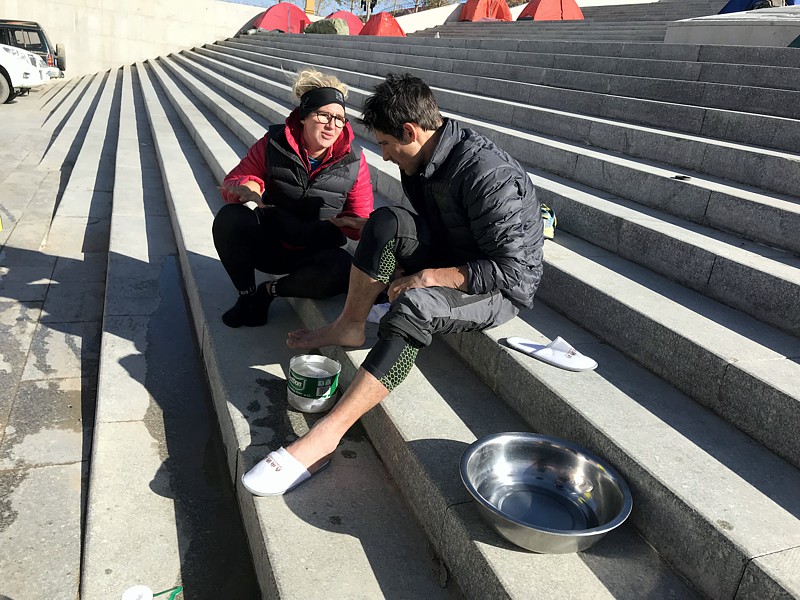 Nohy jsou jak v ohni a ani hůlky moc nepomáhají. Vstupuji do města. Musím působit jako zjevení. Párkrát sednu na lavičku. Pár lidí mne dokonce žádá o svolení k fotografování. Je mi to jedno, toto ještě asi neviděli. Najednou se přede mnou objevuje běžec, že prý stanice je za pár stovek metrů. Nakonec je to tak, že ho za mnou vyslali, aby mne doprovodil. Ještě před příchodem na stanici si odskočím na normální záchod (stanice je 200 metrů daleko a v tomto stavu je třeba šetřit každým krokem), což je po těch hodinách svátek. Mám za sebou 294 kilometrů a asi 81 hodin. Je ráno, celkem teplo. Po delší době si uvařím jídlo a hrnu se do zdravotnického stanu. Po konzultaci jdeme raději ven, kde si vyzuji boty. Následují ponožky. Začnu sloupávat tejpy z předchozího ošetření. Pohled je tak hrozný, že si musím nohy umýt sám, nikdo jiný na to žaludek neměl.