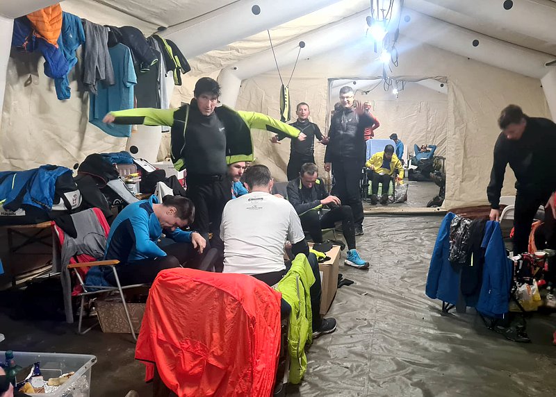 The ranks of runners are starting to thin. Unfortunately, Dusan drops out due to health problems that resemble a heart attack. Dusan really doesn’t look well, and I’m not surprised he doesn’t respond positively to suggestions like “forget this, let’s push for the next lap.” I still manage to keep up my ritual of changing clothes—I always stay dry, which is crucial in these temperatures. By my standards, I’m still feeling light. In contrast, Zdenek is beginning to sag during breaks. It’s surprising because it’s relatively warm in the tent, and Zdenek is generally more resistant to the cold than I am.